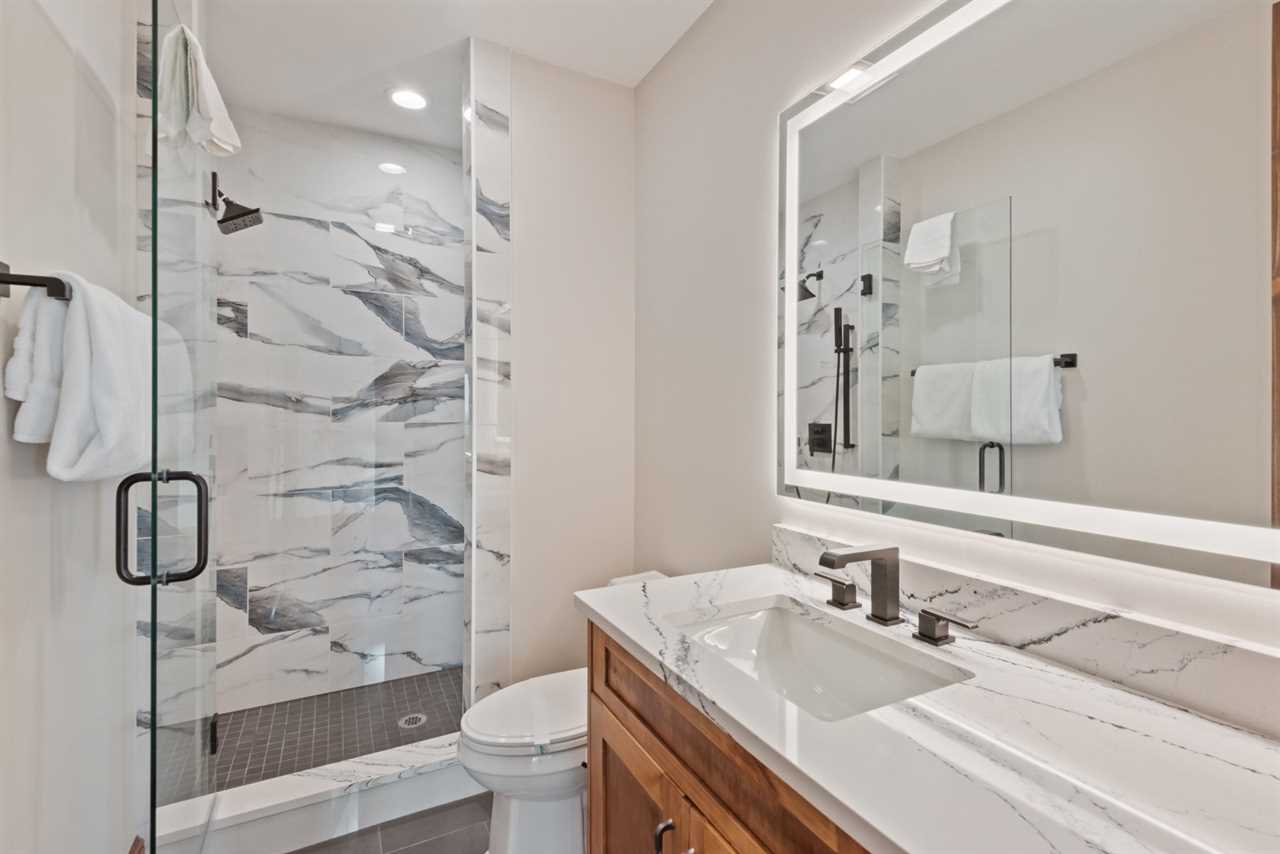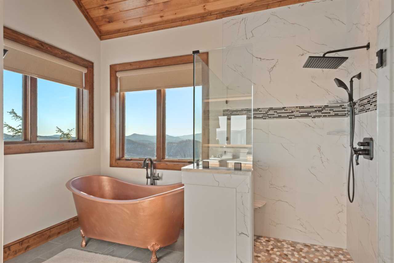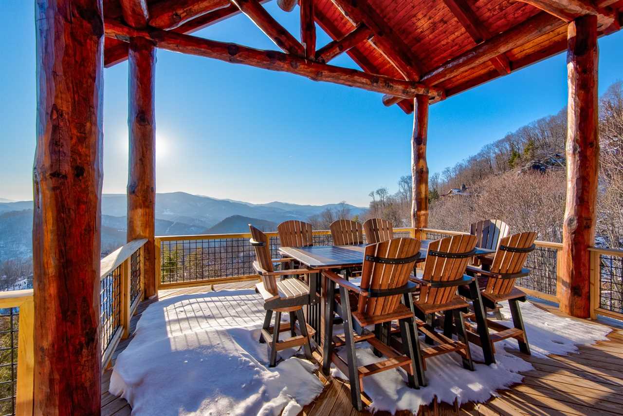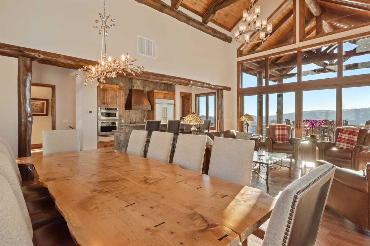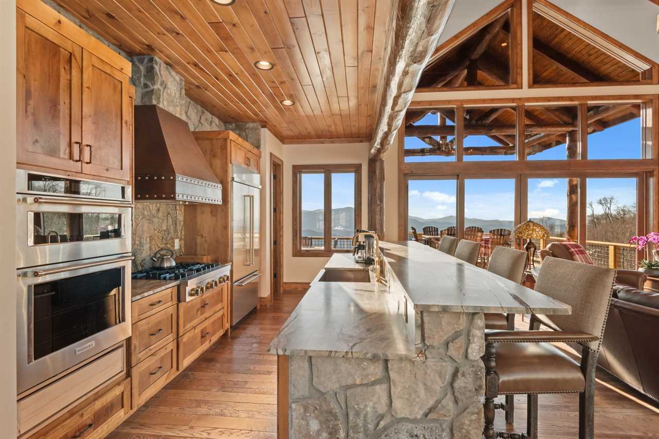 Enjoy the convenience of the spacious two-car garage while staying at Eagle Ridge. With just two steps leading into the main level, you'll enter an open-concept kitchen and great room. The dining table seats ten guests, while the granite bar provides four additional seats. Gather around the gas log fireplace or settle in for a movie on the flatscreen TV mounted above the mantle. Step outside to the covered section of the main-level deck and dine al fresco with stunning long-range mountain views. The primary king ensuite offers private access to the main deck and features a walk-in closet, double granite vanity, lighted mirror, copper soaking tub, and a tiled shower with both a waterfall showerhead and handheld wand.