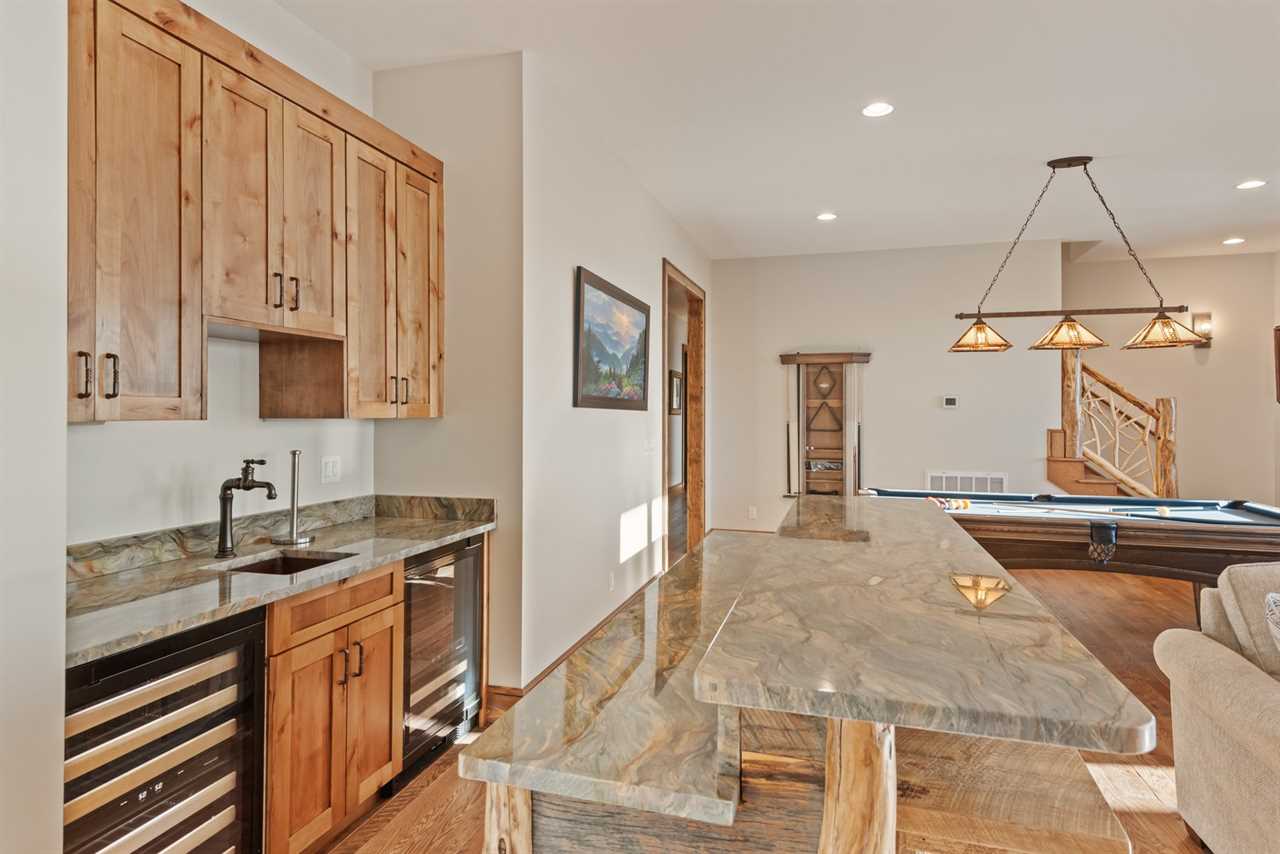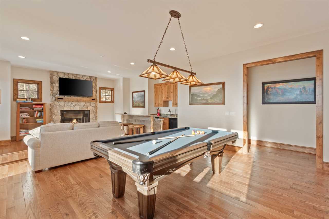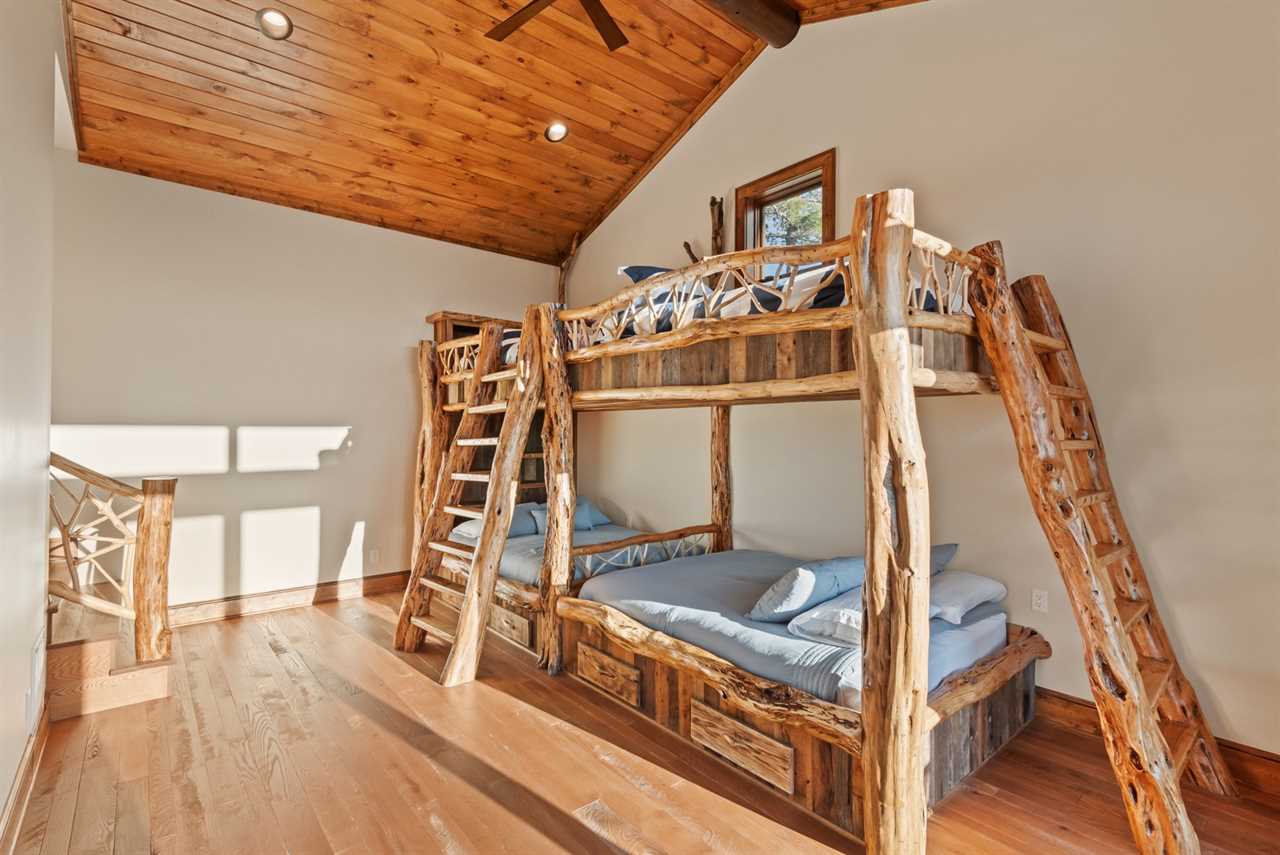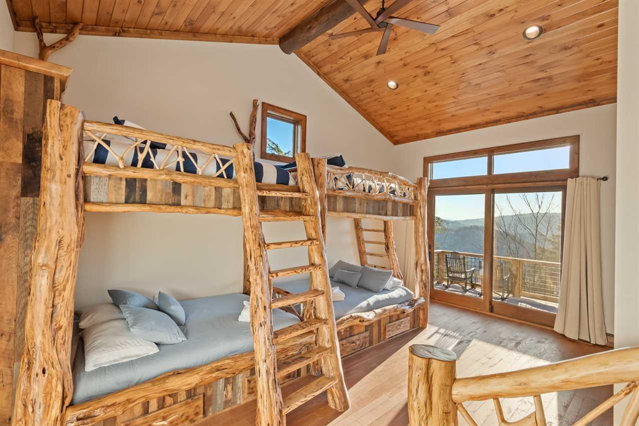 On the lower level, you'll find a den with a gas log fireplace, wet bar, beverage cooler, and pool table. A comfortable sofa and flatscreen TV offer space to relax, with nearby access to the lower deck and hot tub. The lower level also includes three bedrooms. The first is a queen ensuite with deck access and a tiled combination tub and shower. A second queen bedroom is located near a full hallway bathroom with a tiled shower. The bunk room, accessed by a few steps, features custom-built log bunks with two full beds over two queen beds and plenty of headroom. A second full hallway bathroom serves this room.