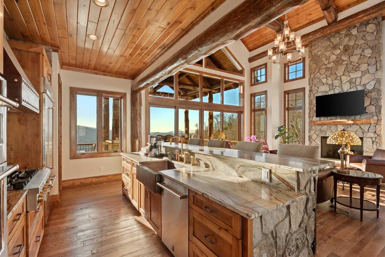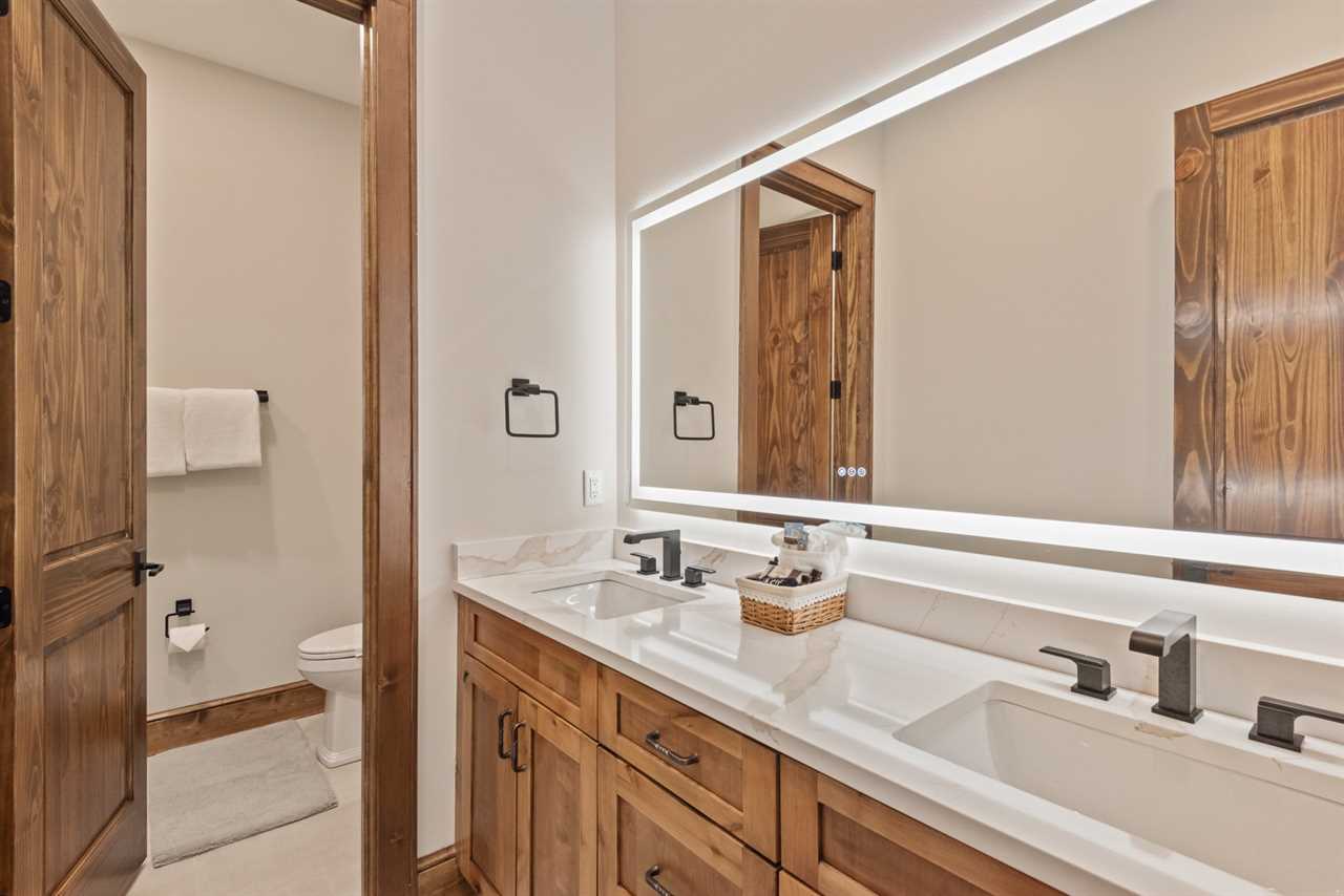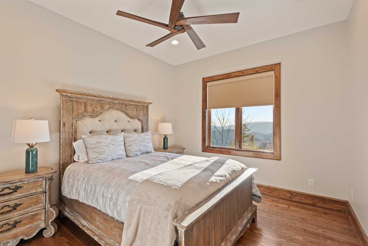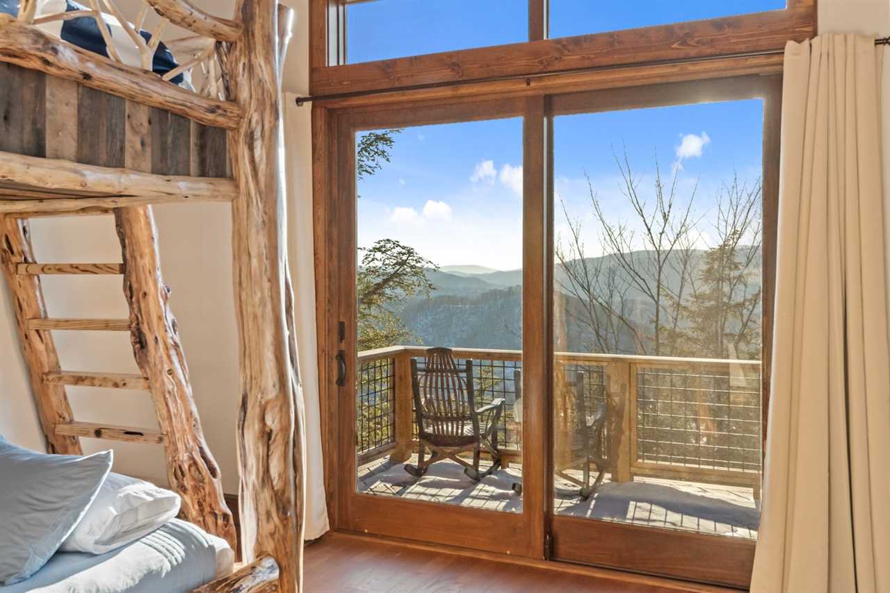 On the lower level, you'll find a den with a gas log fireplace, wet bar, beverage cooler, and pool table. A comfortable sofa and flatscreen TV offer space to relax, with nearby access to the lower deck and hot tub. The lower level also includes three bedrooms. The first is a queen ensuite with deck access and a tiled combination tub and shower. A second queen bedroom is located near a full hallway bathroom with a tiled shower. The bunk room, accessed by a few steps, features custom-built log bunks with two full beds over two queen beds and plenty of headroom. A second full hallway bathroom serves this room.