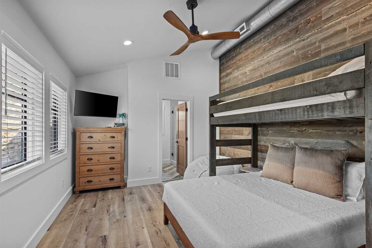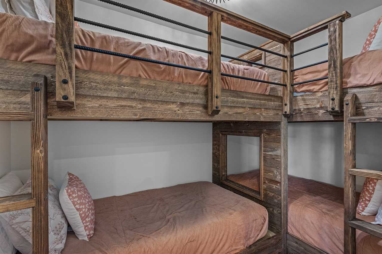 Lower Level: King bedroom with private ensuite bath; private space with four twin beds and hallway bathroom.
