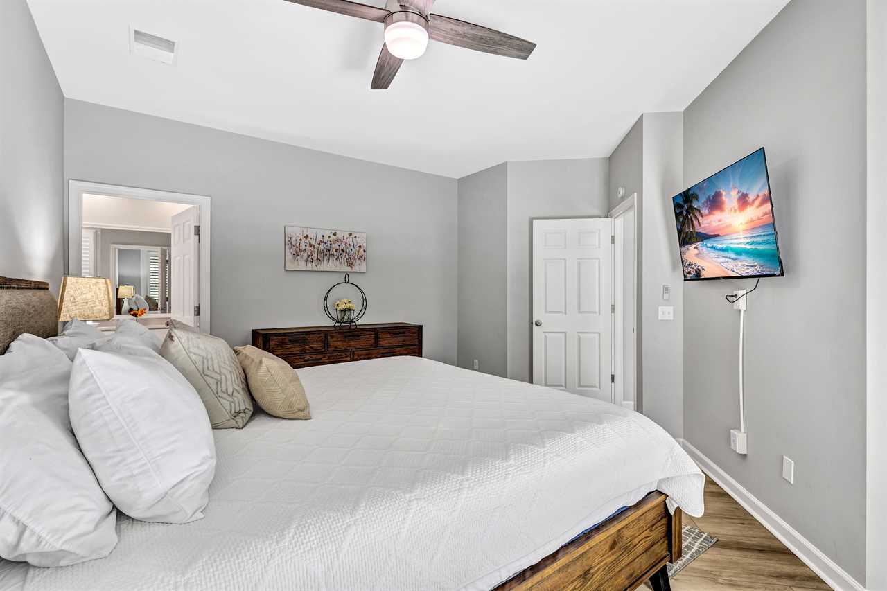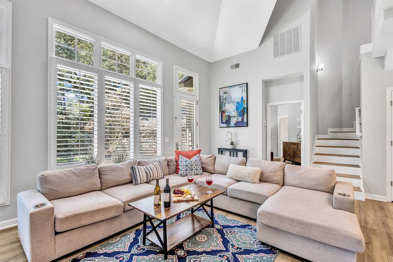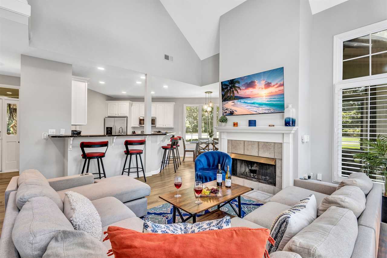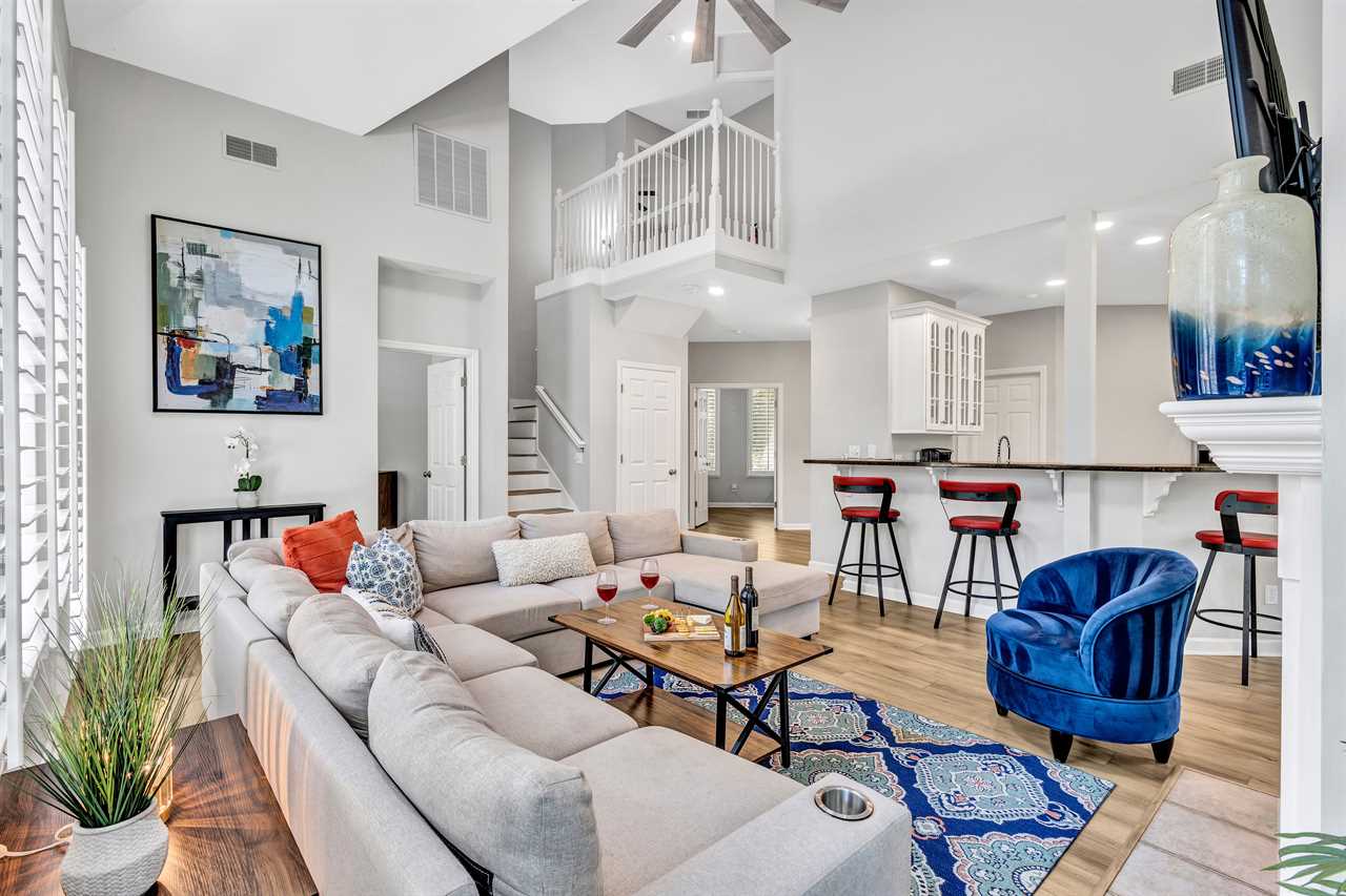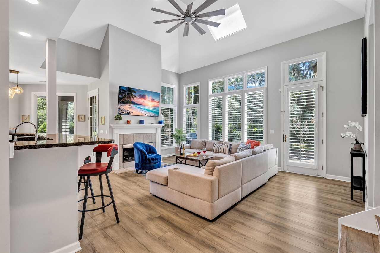 Gather your group in the open concept living space, designed with comfort and entertainment in mind. A sectional sofa, large flat-screen TV, and stylish decor make it the perfect spot to unwind after a day in the sun.