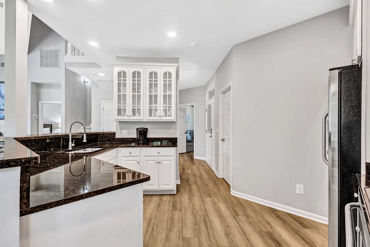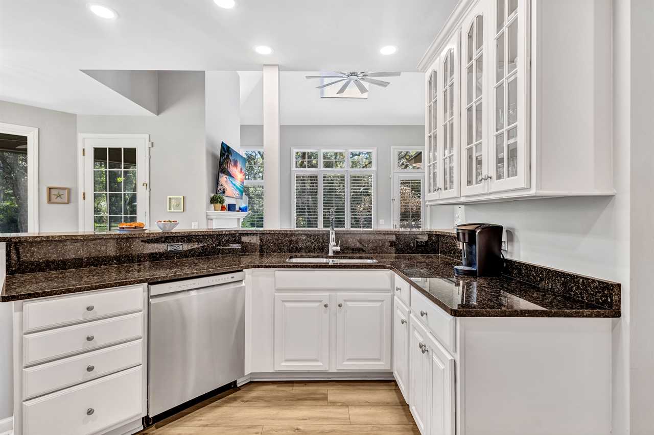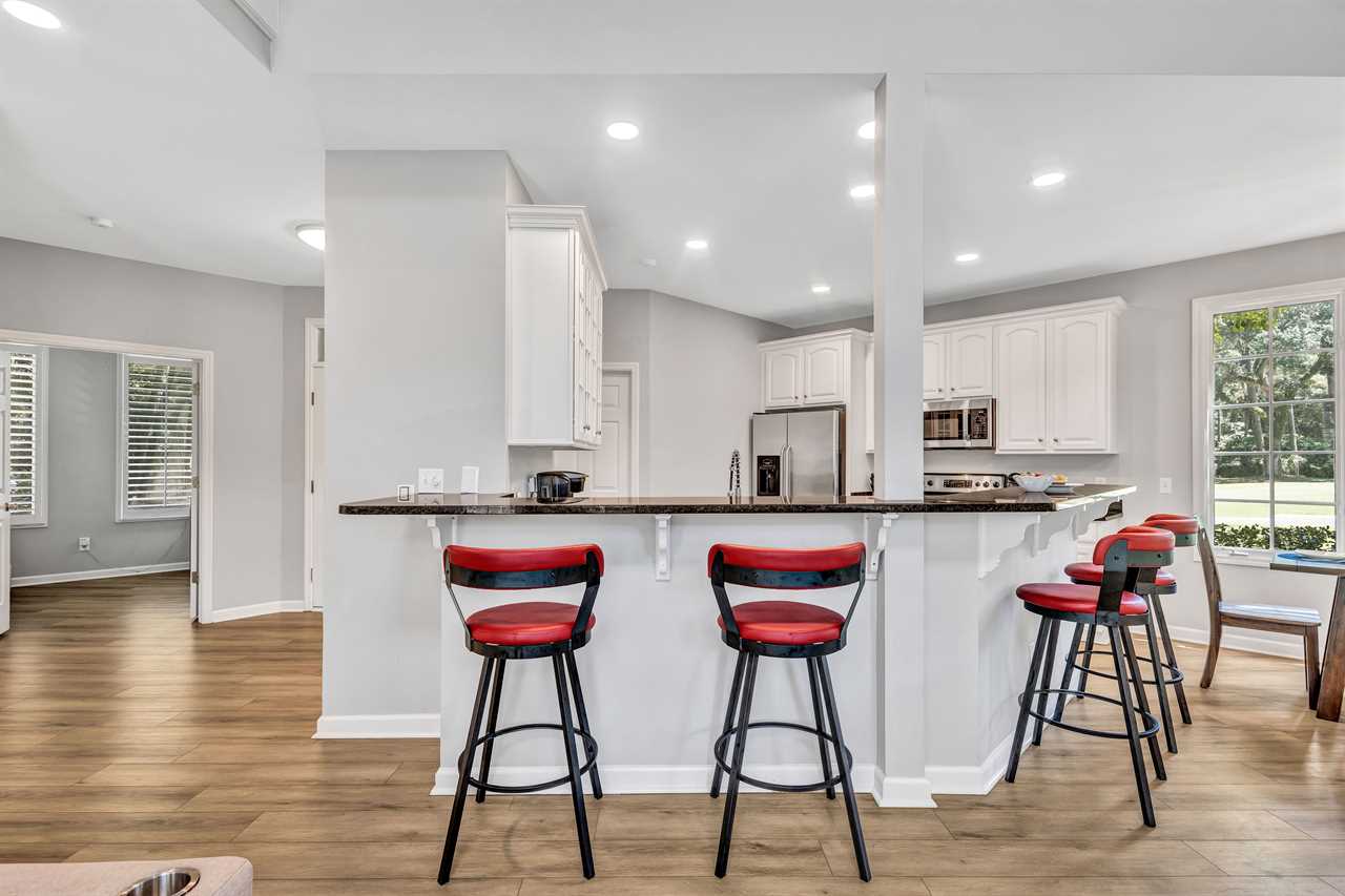 Enjoy preparing delicious meals with our stainless steel appliances, including a dishwasher, microwave, toaster, and Keurig coffee maker. The breakfast nook overlooks scenic views of the greens with seating for all, including additional barstool seating at the kitchen counter.
