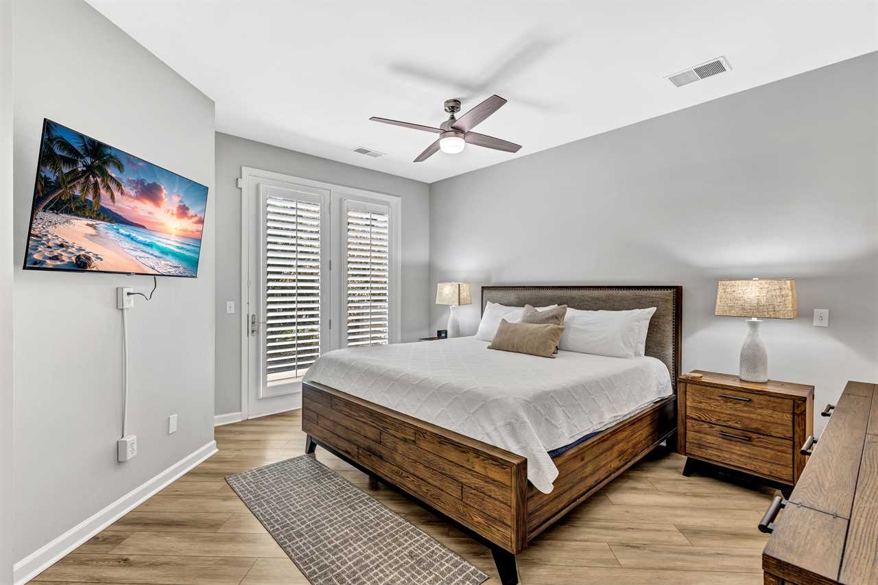 On the first level, you'll find the Primary suite located off the living room. This Primary suite boasts convenient deck access, a luxurious king bed, a Smart TV, and an en-suite bathroom equipped with a soaking tub and walk-in shower. The first floor also has a bonus room that highlights a twin daybed and twin trundle, sleeping 2.