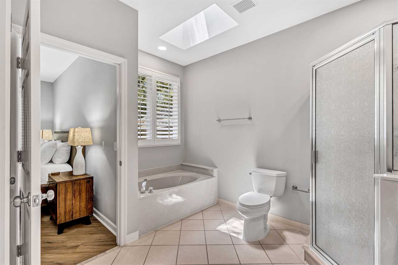 ✓ Bedroom 1: Primary King suite, en-suite bathroom with walk-in shower and tub, access to deck, Smart TV