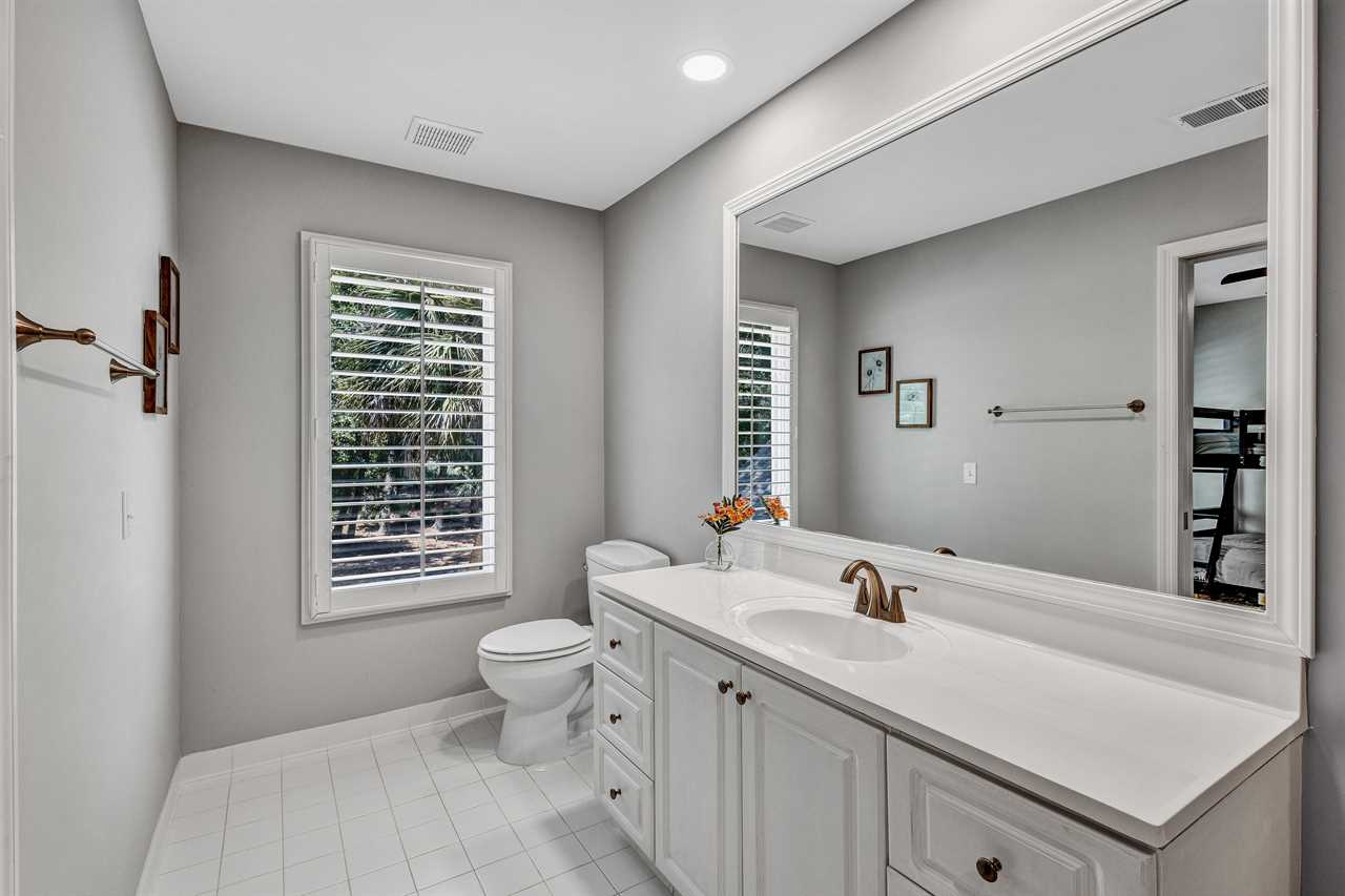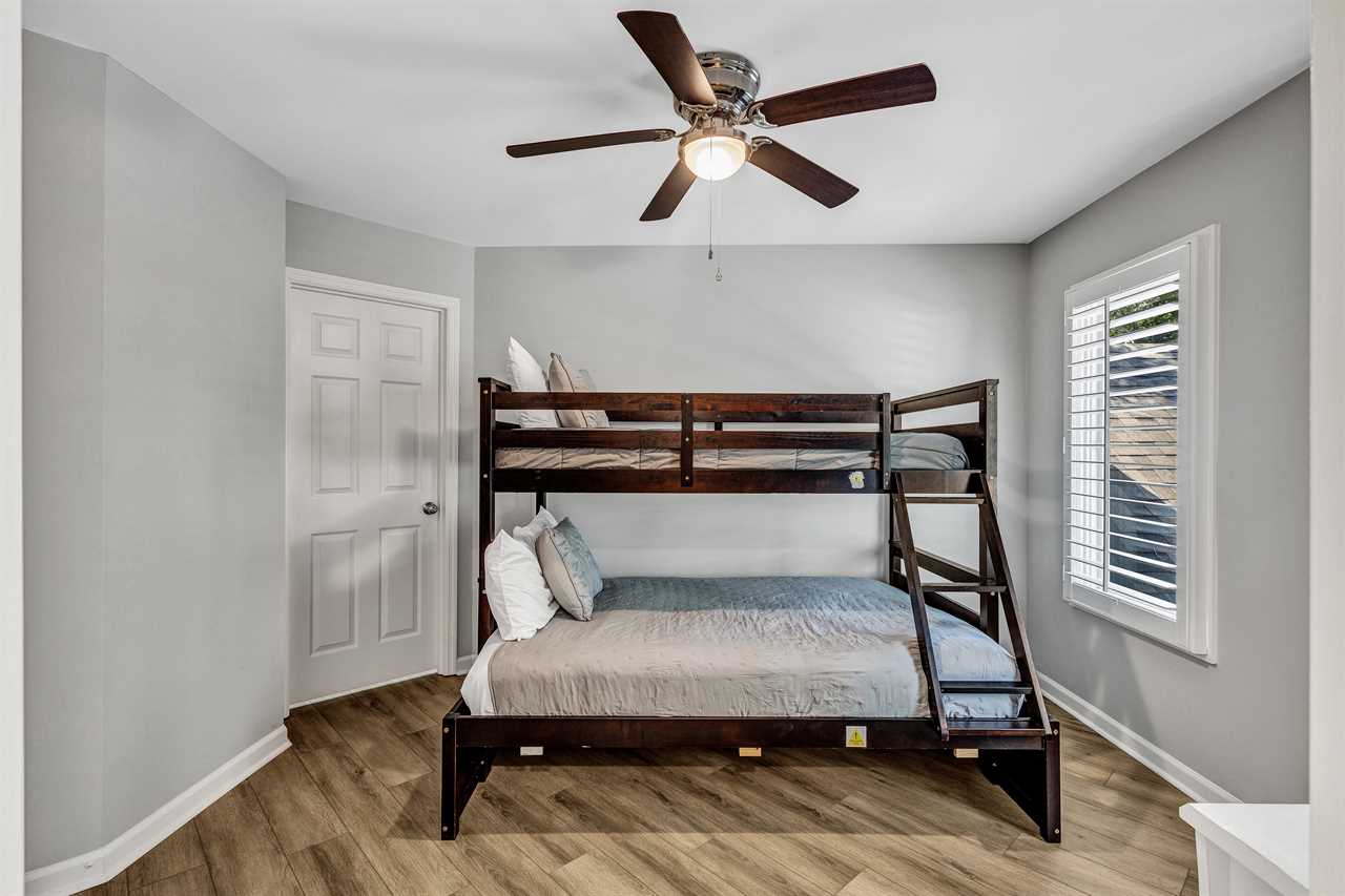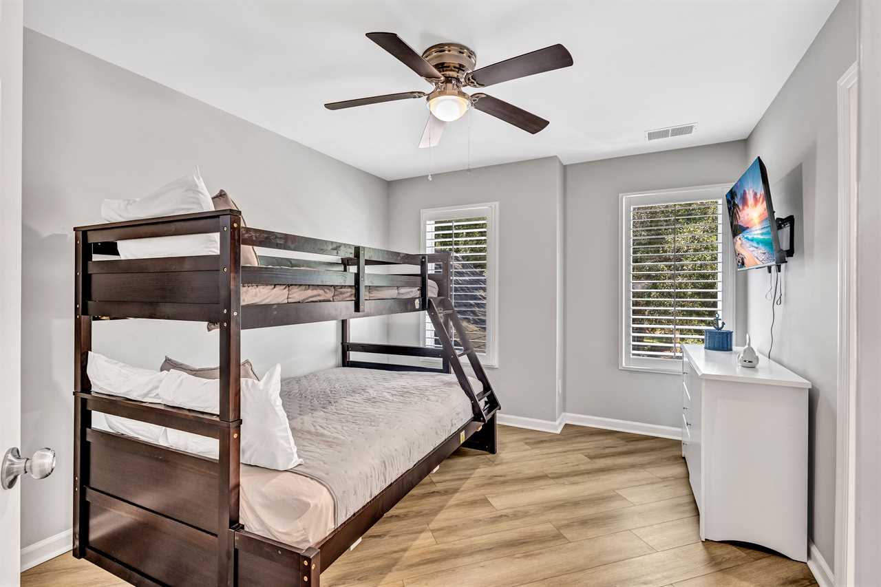 Venture up to the second level, where two comfortable bedrooms share a jack and jill bathroom with double vanity sinks & shower/tub combo. Bedroom 2 has a twin/double bunk bed and Smart TV. Bedroom 3 has 2 full-sized beds and a Smart TV.