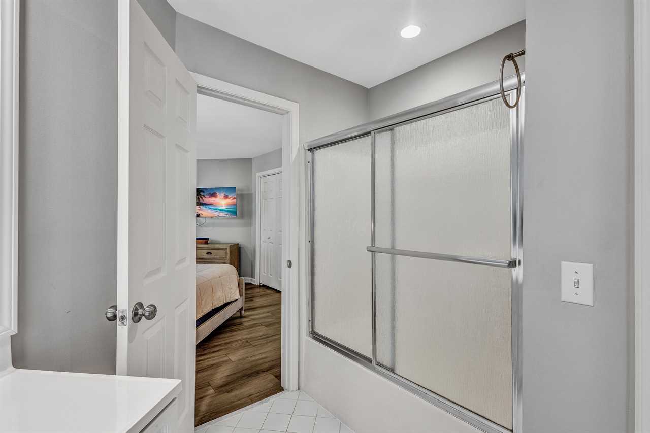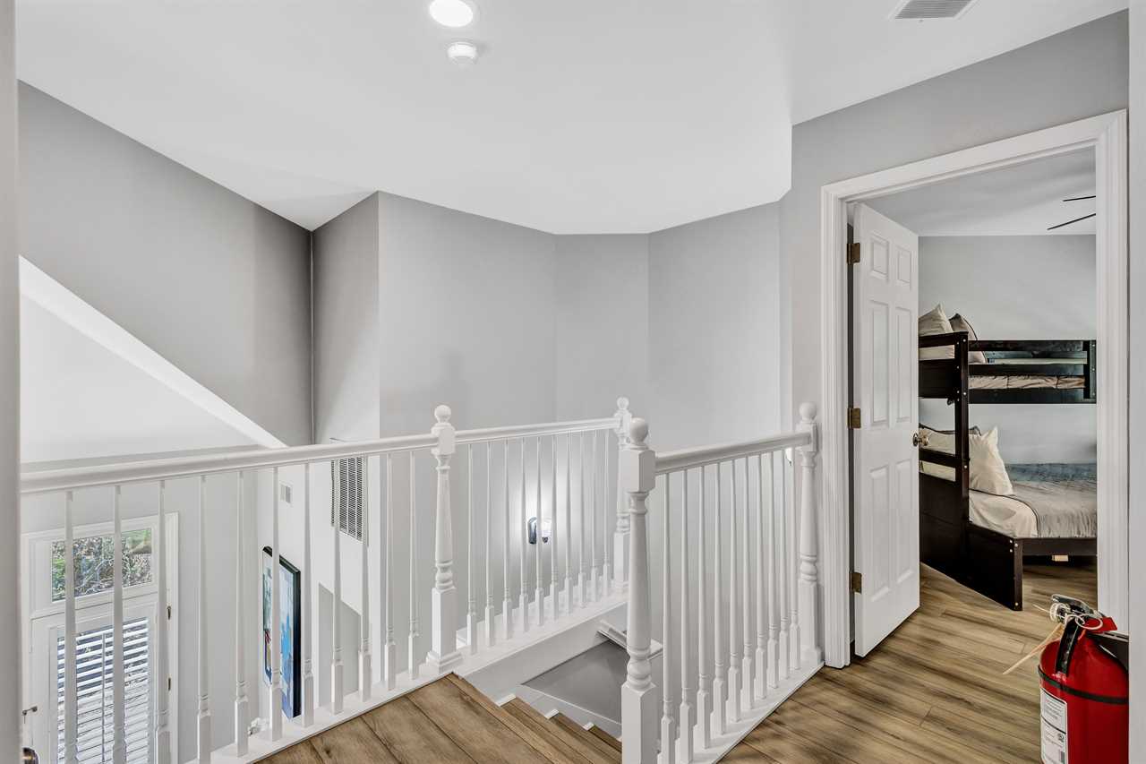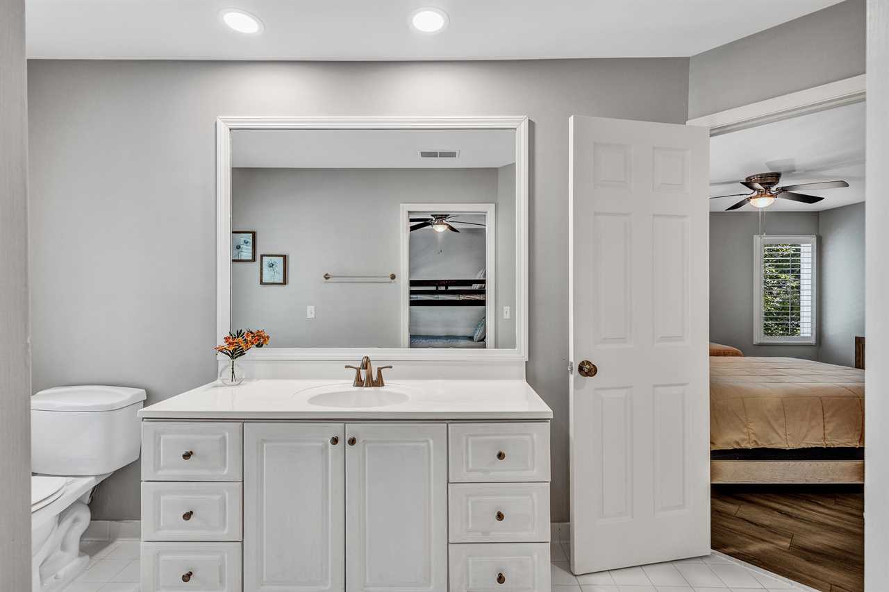 Venture up to the second level, where two comfortable bedrooms share a jack and jill bathroom with double vanity sinks & shower/tub combo. Bedroom 2 has a twin/double bunk bed and Smart TV. Bedroom 3 has 2 full-sized beds and a Smart TV.