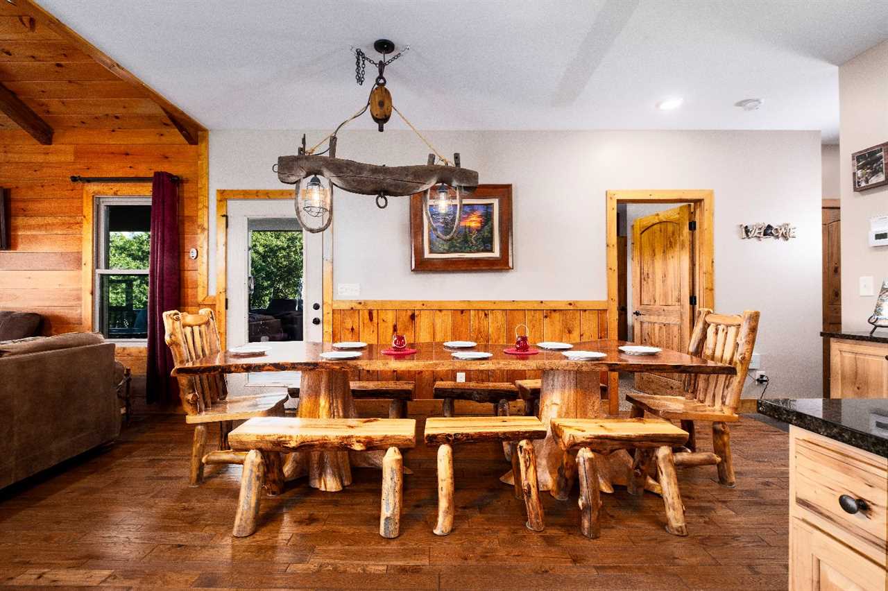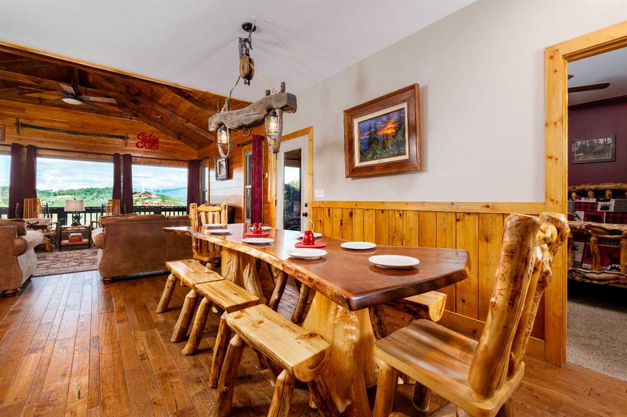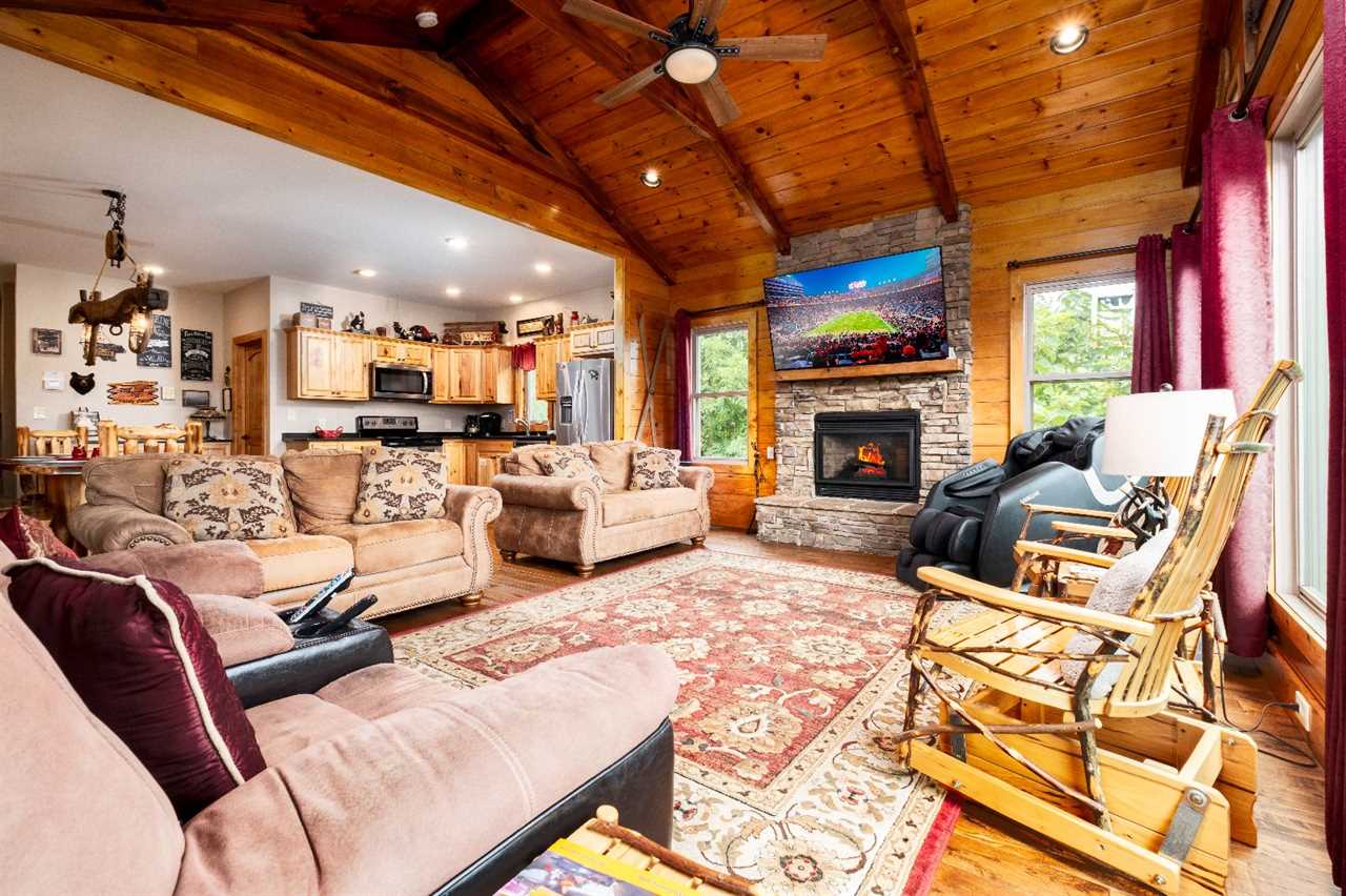 Inside, 2,675 square feet of space is thoughtfully designed for relaxation and fun. The living room features picture windows that frame the mountains, a stacked stone gas fireplace, and plush seating — including a massage chair — for movie nights on the big screen TV. The open kitchen is fully equipped and perfect for preparing group meals, complete with a standard drip coffeemaker and Keurig. Gather around the rustic log-style dining table, where every meal feels like a moment worth celebrating.