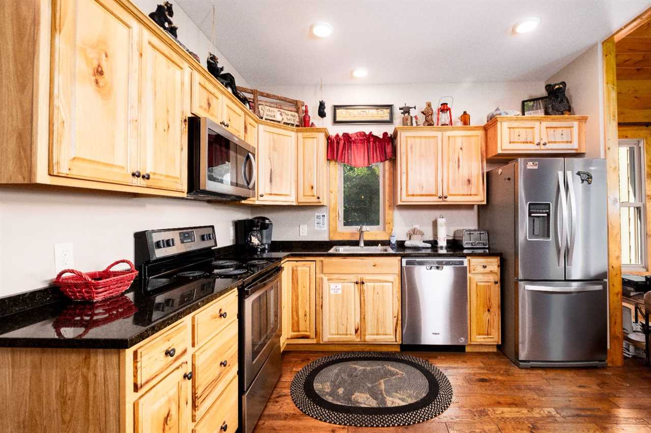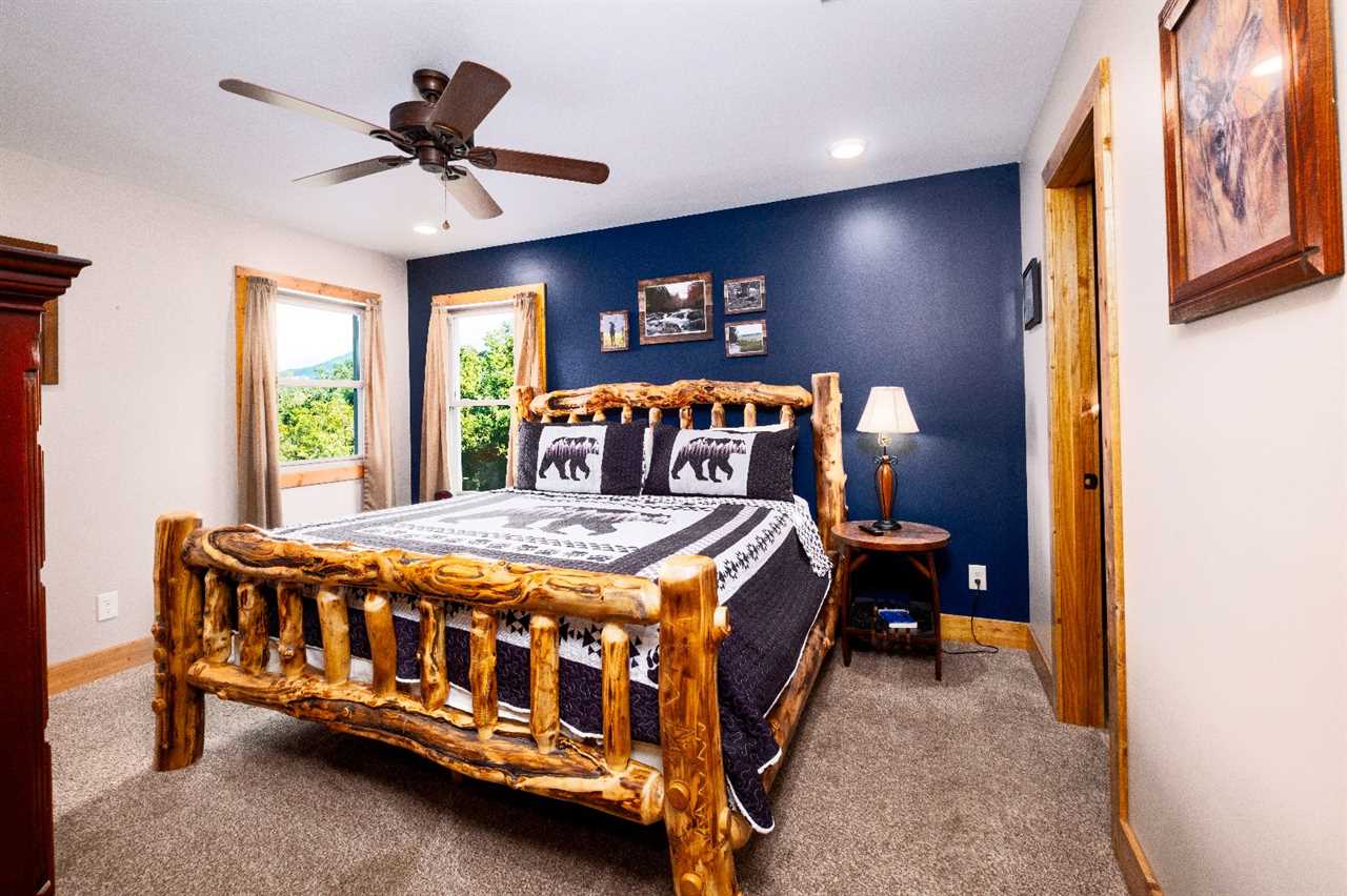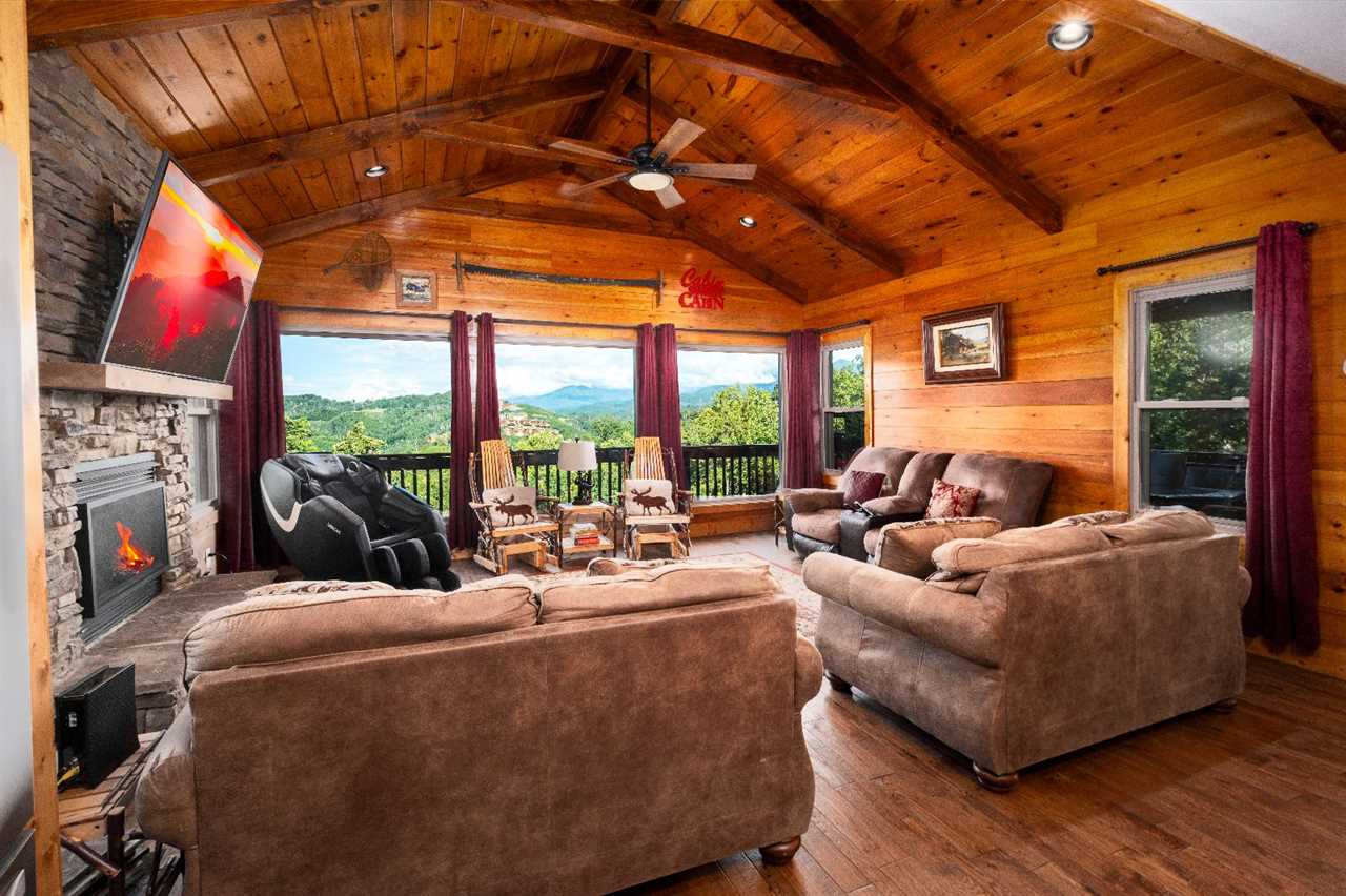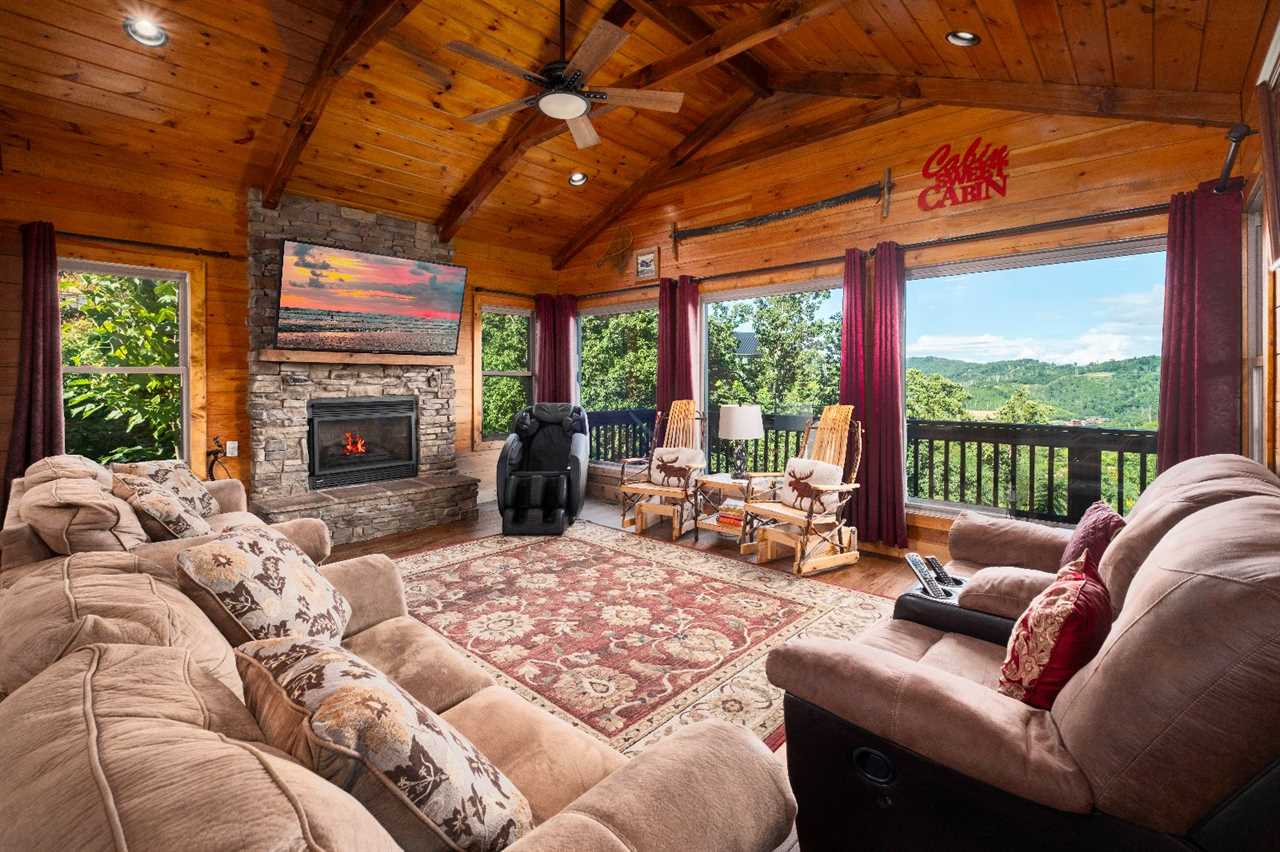 Inside, 2,675 square feet of space is thoughtfully designed for relaxation and fun. The living room features picture windows that frame the mountains, a stacked stone gas fireplace, and plush seating — including a massage chair — for movie nights on the big screen TV. The open kitchen is fully equipped and perfect for preparing group meals, complete with a standard drip coffeemaker and Keurig. Gather around the rustic log-style dining table, where every meal feels like a moment worth celebrating.