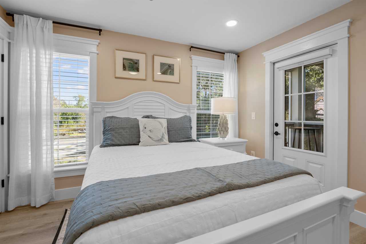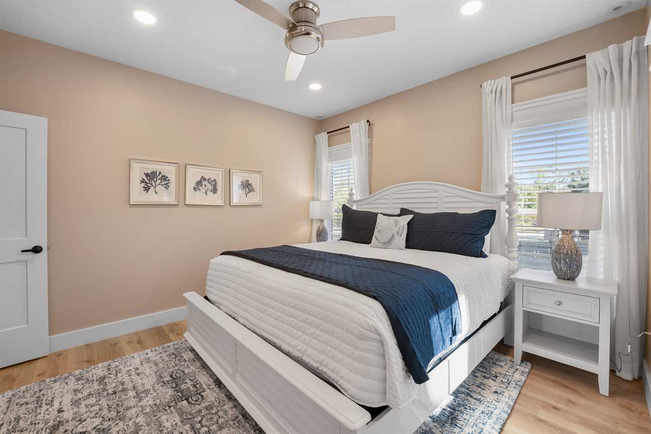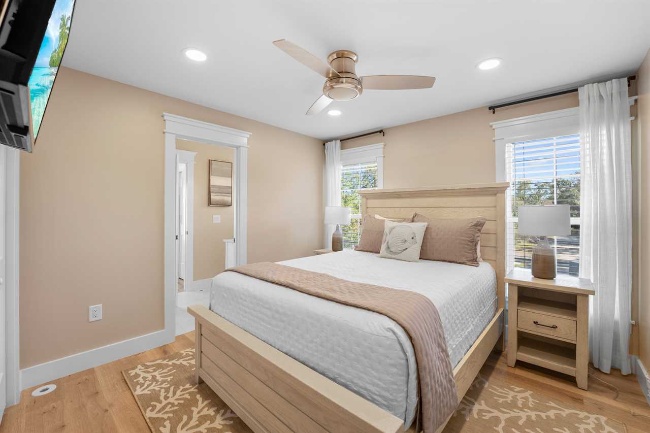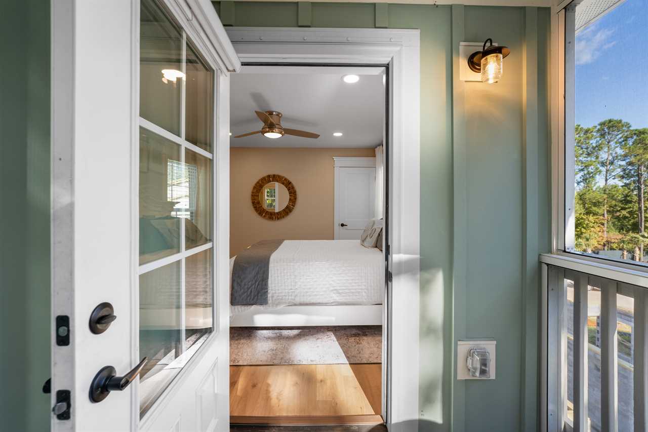 The second level is home to the Primary Bedroom, featuring a King bed, en-suite bathroom with a double vanity, a spacious walk-in shower, and access to a cozy screened porch—perfect for morning coffee or an evening unwind. A convenient half bath is also located nearby, just off the kitchen area.