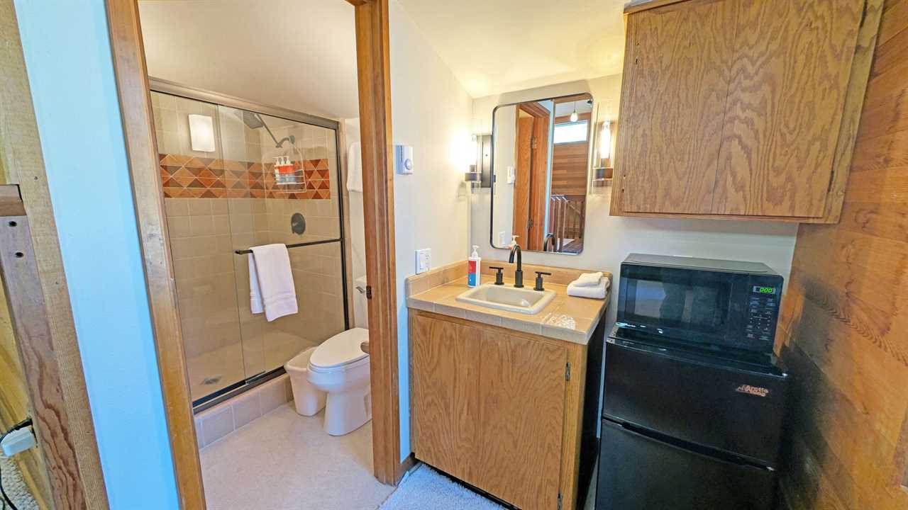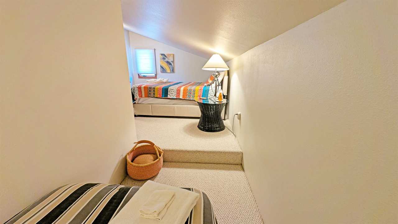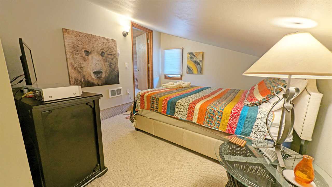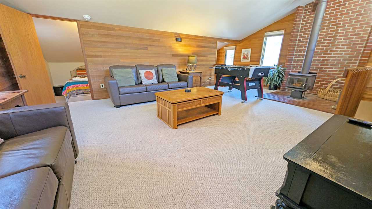 - Loft Area: Queen bed and twin bed, smart TV, and wood stove; bath with shower/tub