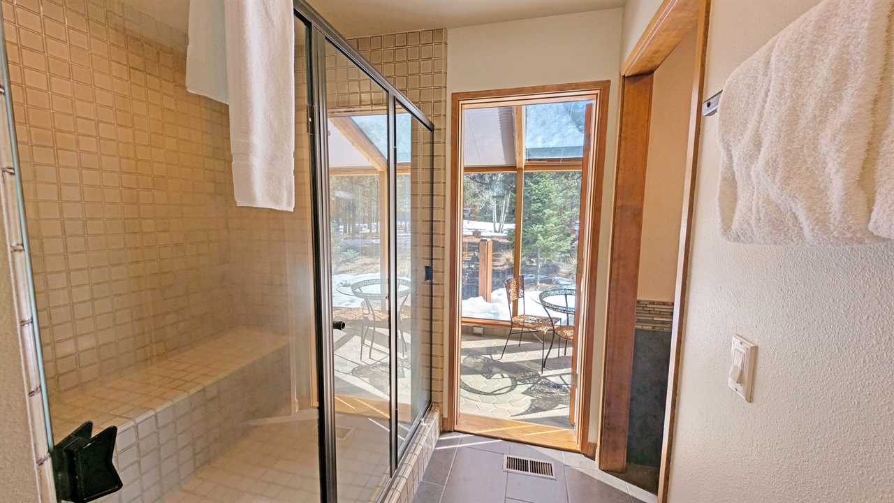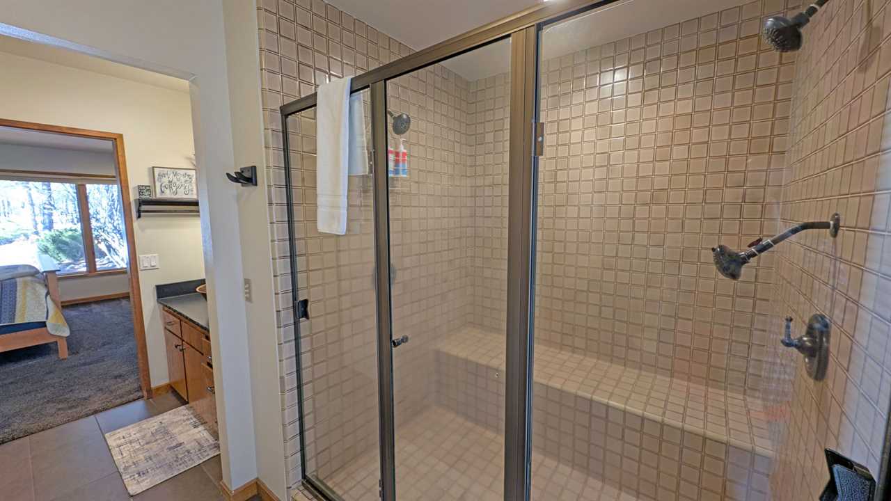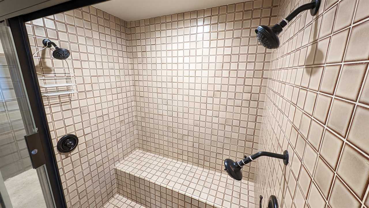 - Primary Bedroom: King bed, flatscreen TV, private en suite with large tiled shower, and joined sunroom